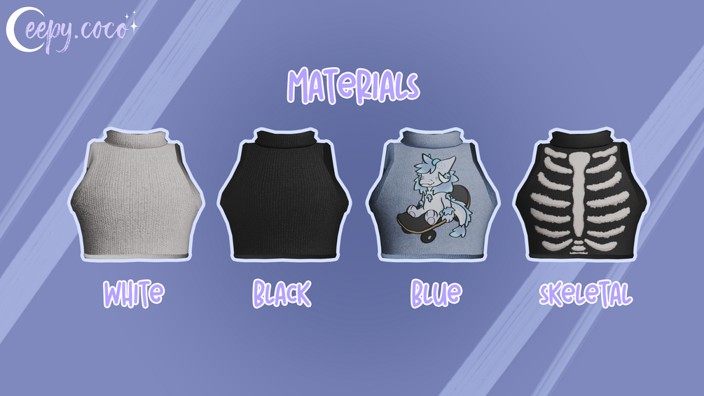 If you have any questions, you can find me in ItsGuusy Community Discord Server where you can ping me in #tech-support (@eepy.coco) or send an email to eepy.coco@gmail.com with the Subject "Winterbold Cropped Tank Top Tech Support".